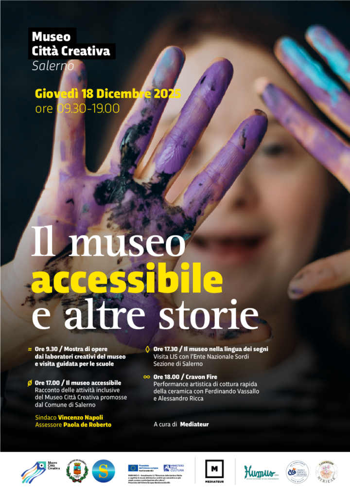 Giovedì 18 dicembre 2025 il Museo Città Creativa di Salerno ospita “Il museo accessibile e altre storie”, giornata conclusiva delle speciali attività dedicate all’accessibilità, all’inclusione e alla partecipazione culturale realizzate nell’autunno 2025.
